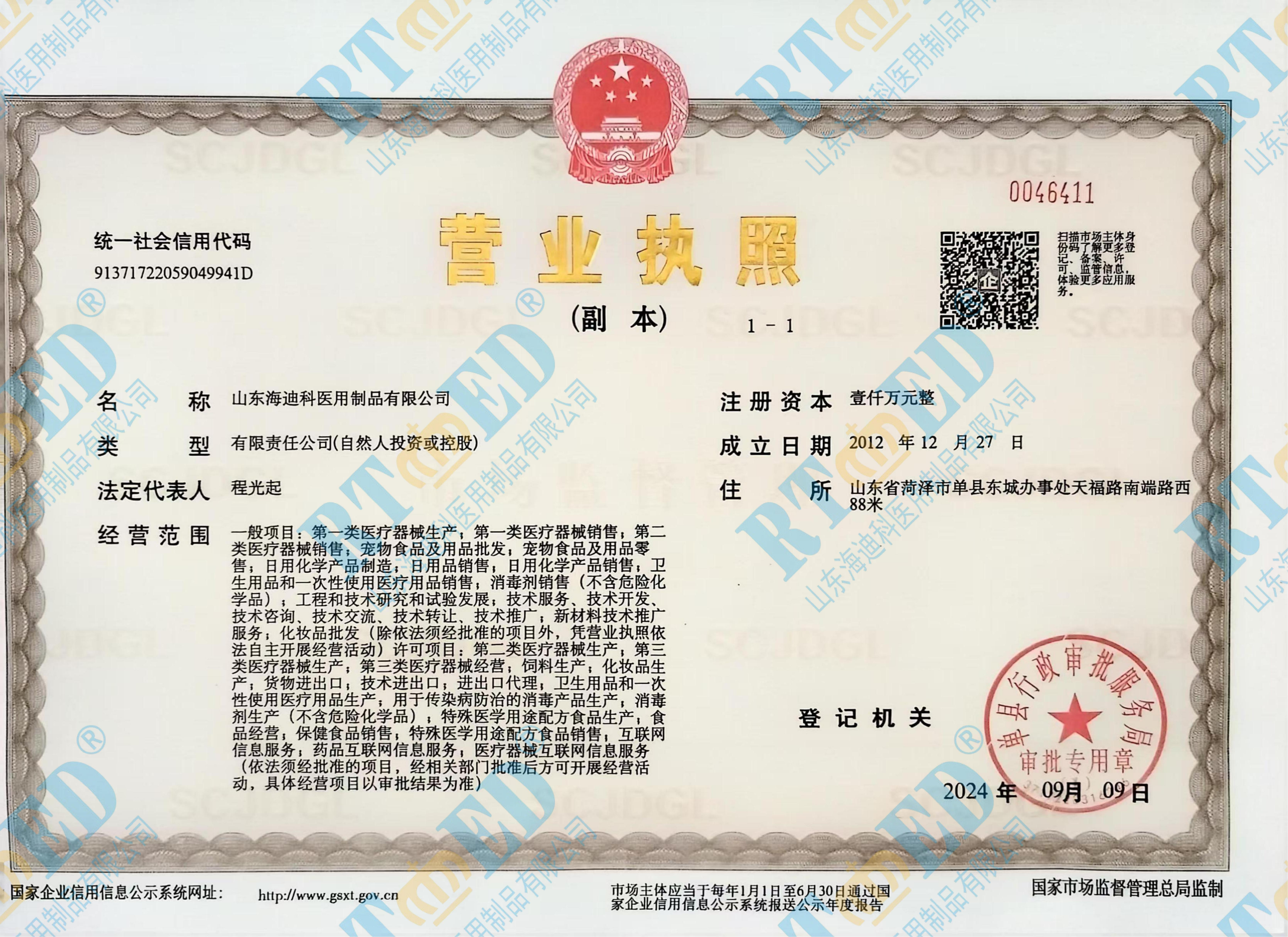 • 海迪科醫療器械生產許可證